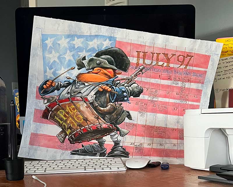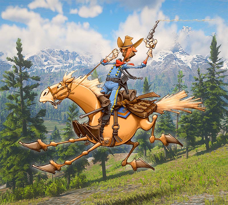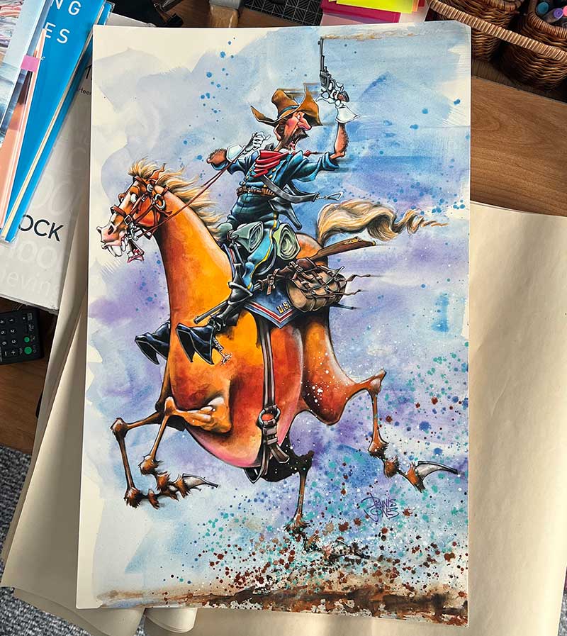 Back in the 90’s, one of my favorite jobs to work on was a centerfold calendar/poster thing for E.C. Magazine. If it was a month like November you, of course, did Thanksgiving themed artwork… but if it was a month like August, they sometimes told me to just do whatever I wanted. I have no idea how this cowboy related to anything going on in August of ’96 but that’s what I came up with. I’m currently experimenting with my work process on the Procreate iPad App, so I took the opportunity to redo my old cowboy.