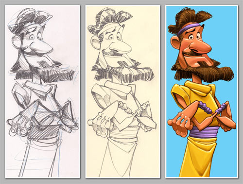 My creative process is a fairly simple one. I start with a fairly loose pencil sketch to incorporate some energy into the picture. I put that on a light table, do a tighter pencil drawing over the top of it, scan that into Photoshop and add color.