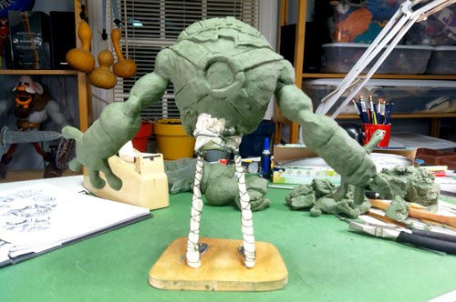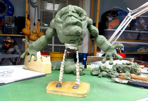 …ok, so what have I learned so far on my first ever stop motion puppet build? Two tiny little aluminum wires will not hold five pounds of clay in the air very well. I had to bite the bullet last night, tear off the bottom half of my sculpt, and build a more substantial armature to support the weight… and you can tell by the look on this guys face that he was none too happy about it…