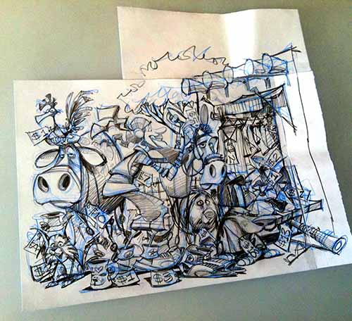 I scan that tighter pencil sketch into my computer, fire up Photoshop and I’m off to the races with the color work.