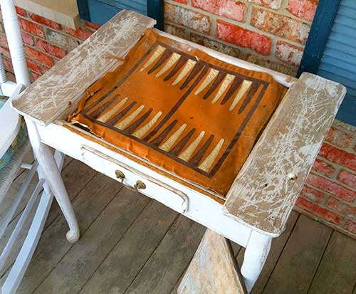 The table became an interesting sort of project. The center top lifts off and a backgammon board is inset beneath it. Unfortunately, time had treated it quite harshly.