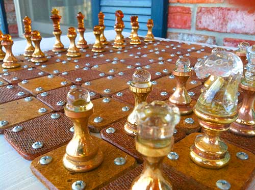 I cut out a new lid from MDF and sawed lines into it to create a weathered slat look. On the flip side I attached a checkerboard.