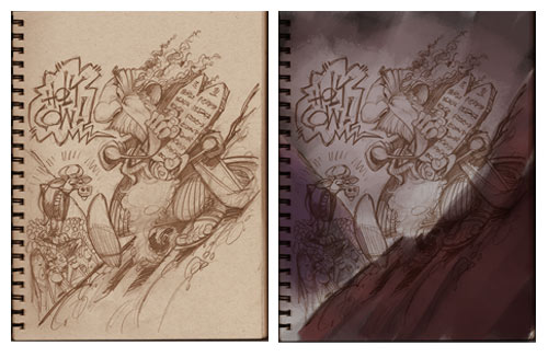 It’s the end of the day, I run across this old sketchbook page in a computer folder and I think maybe I’ll just throw a little color on it and see what happens before I go eat dinner. Here’s what I came up with…