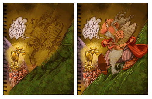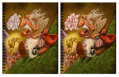 I used to do a one panel cartoon for my church’s weekly newsletter and when I drew this episode in the life of Moses (not nearly so well as you) I used the same,”Holy Cow!” caption! I guess great minds do run on the same track or something like that.