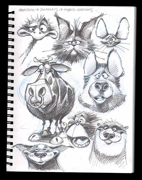 Stan, the bulk of what I do comes from my imagination mainly because it’s too much trouble to run down reference photos plus it’s really hard to find a good picture of a dog wearing a business suit smoking a pipe. With that being said, for this particular sketch page I Googled “funny looking animals”, a page full of photos popped up and I drew the ones that I thought were most interesting.
