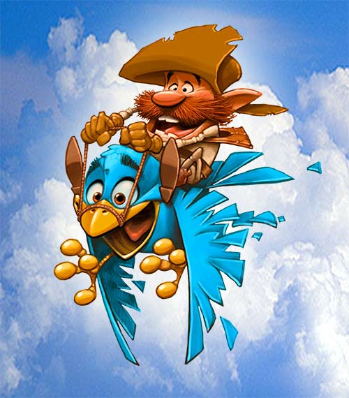 • Jeff, I didn’t even see that. I was just drawing a character with a bucket mouth and a bushy mustache, but you are exactly right. The little fellow riding the bird is exactly the little fellow we had on the Rangers hockey jerseys way back when! ha!