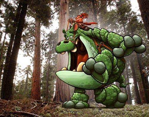 I wanted to get  a size relationship on one of these creatures I created, so I tossed a guy on his back and put him next to a stand of redwood trees.