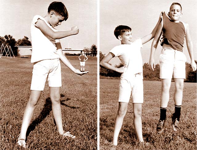 For those of you that may not know, I am one of three brothers and we have worked together on projects all of our lives. Before Photoshop was ever conceived, big brother Doug was manipulating photos in REAL TIME with an actual FILM camera… below is an early example. I’m getting ready to squash my little brother Donny in the first photo and lifting him off the ground with my superhuman strength in the second.
