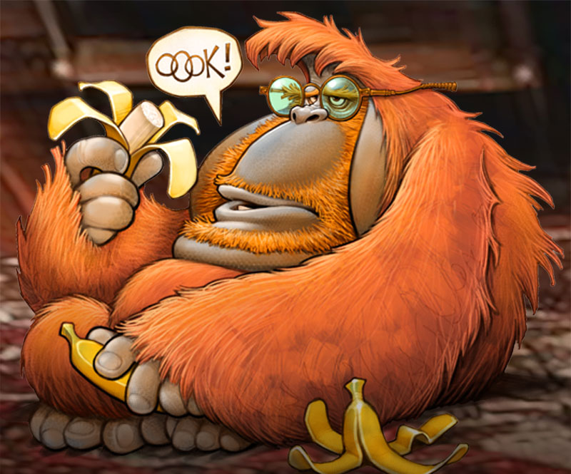 The head librarian at Unseen University who was accidentally transformed into an orangutan, found the new body perfect for library work and refused to be transformed back. Students and faculty have come to accept this and the administration is happy to have a staff member they can literally pay in bananas.