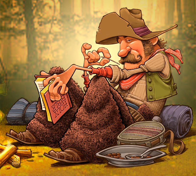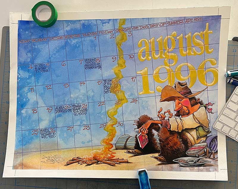 Back in the 90’s, one of my favorite jobs to work on was a centerfold calendar/poster thing for E.C. Magazine. If it was a month like November you, of course, did Thanksgiving themed artwork… but if it was a month like August, they sometimes told me to just do whatever I wanted. I have no idea how this cowboy related to anything going on in August of ’96 but that’s what I came up with. I’m currently experimenting with my work process on the Procreate iPad App, so I took the opportunity to redo my old cowboy.