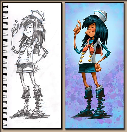 This picture started out as a doodle in my sketchbook. I scanned it into Photoshop, (CS6), made it a multiply layer and began blocking in color on a normal layer underneath. When I get the mid and darker values established, I create a normal layer above the line art and put in the lighter values. At the very end I add just a little black line but not too much… too much black will kill the picture. I merge all the layers together, then create a green layer underneath the art. I erase everything I dont want on the art. As I do this, the green layer underneath helps me to see what I am doing. My image is cut out and now I need a background. I type into Google “blue sky” and find some clouds which I drop into the background. I add just a bit of glow around my figure to separate him from the background and I’m done.