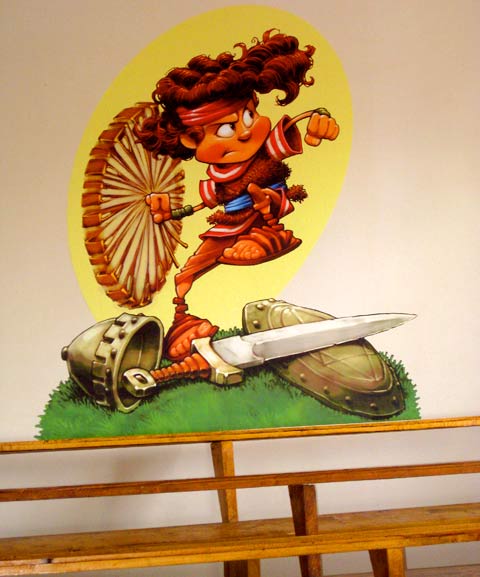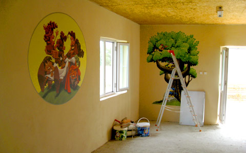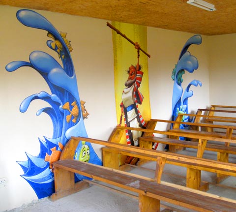 I just spent a week in Braila, Romania and the good folks over at N-Ovation donated some of my wall art to be put up in the Sunday School classroom behind the Roma Church in Spiro Haret. I had never personally worked with this product before, but now that I have I can wholeheartedly vouch for it. These are vinyl wall coverings with an adhesive back. I’m guessing they are probably meant to adhere to a smoother surface, but the walls I put them on were rough as a cob and in spite of that, the “Walleeze” stuck to them like a trooper.